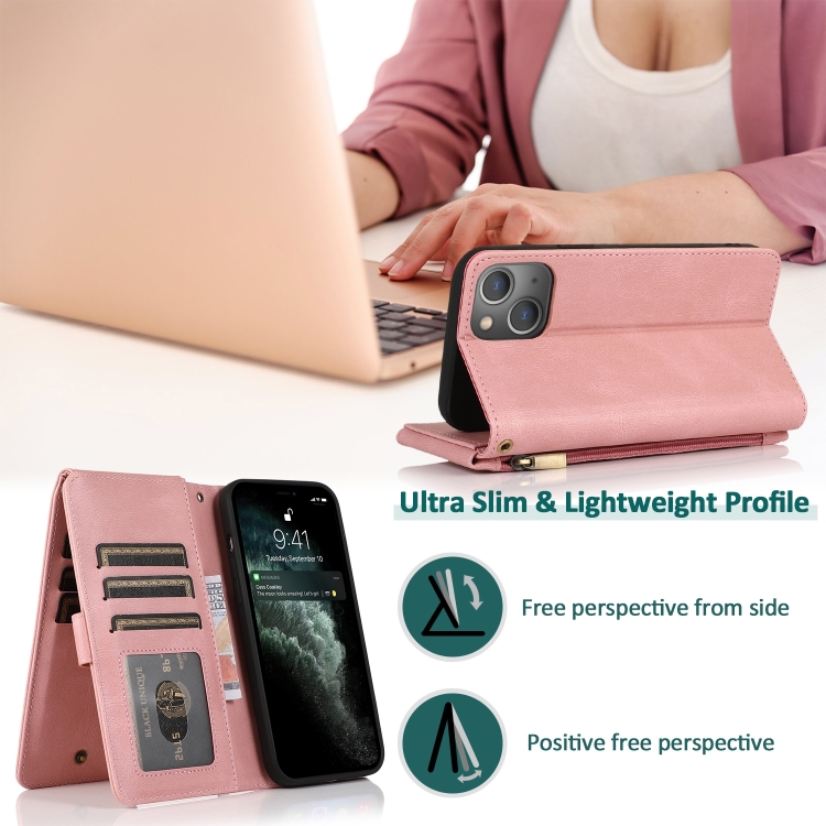 Funda de Cuero con Cremallera para iPhone 14 (Oro Rosa)