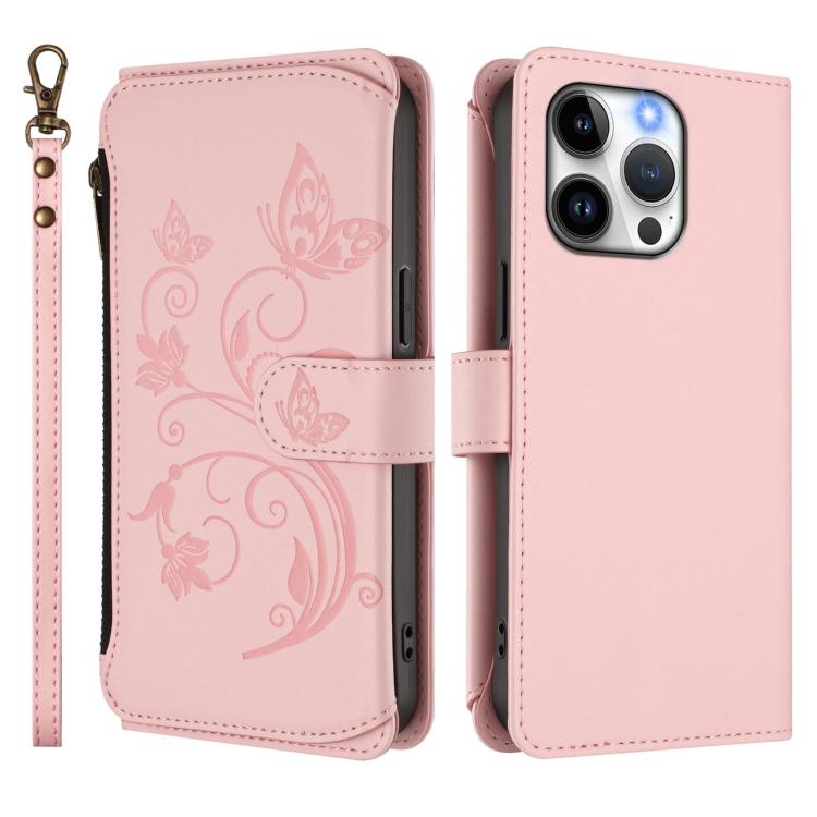 Funda de cuero con cremallera para iPhone 14 Pro, diseño de mariposas, flores y amor, con múltiples tarjetas (rosa)