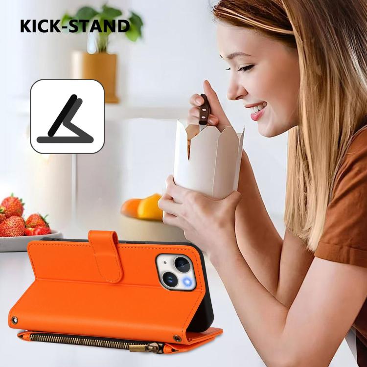 Funda de cuero con cremallera para iPhone 15 Plus, diseño de mariposas, flores y amor (naranja)