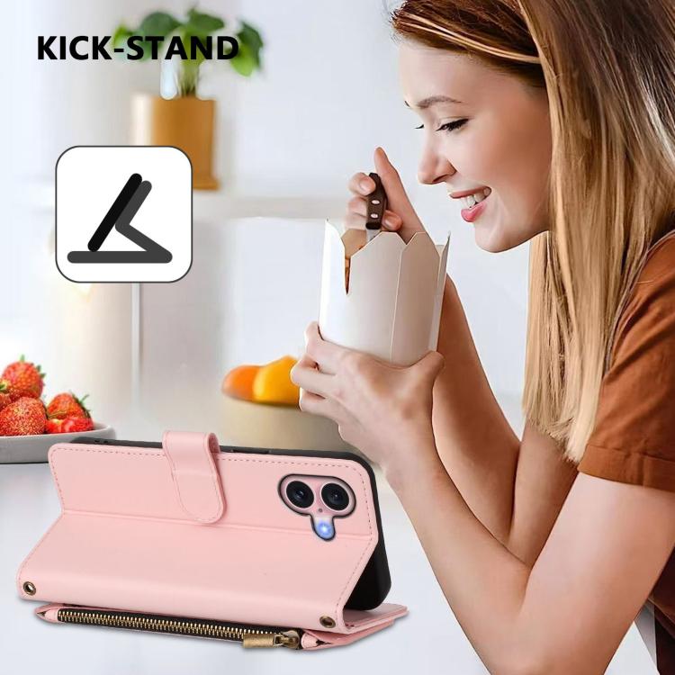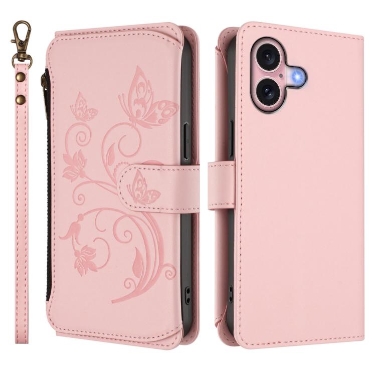 Funda de cuero con cremallera para iPhone 16 Plus, diseño de mariposas, flores y amor (rosa)
