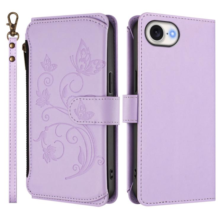 Funda de cuero con cremallera para iPhone 16e, diseño de mariposas, flores y amor (morado claro)
