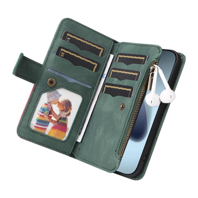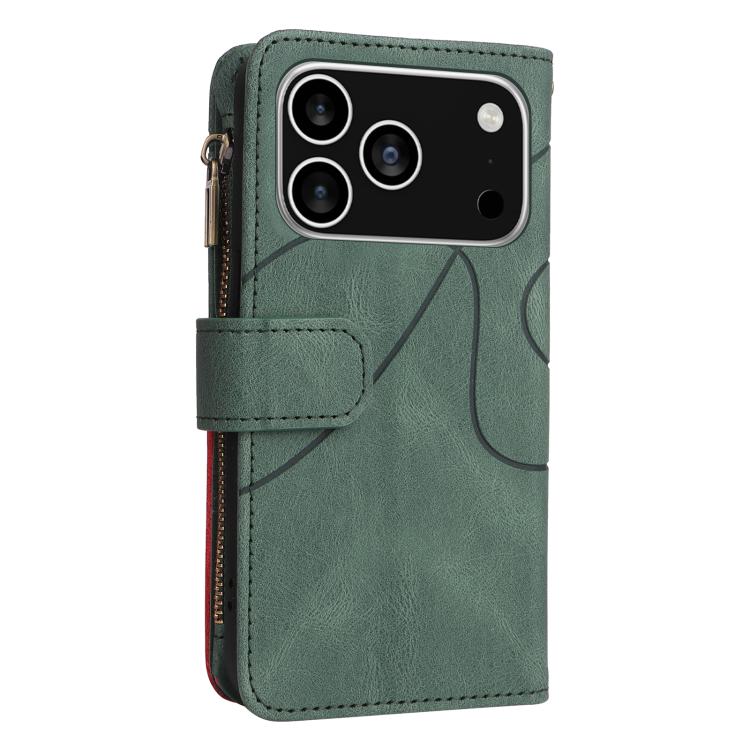 Funda de cuero con cremallera para iPhone 17 Pro, bicolor, con 9 ranuras para tarjetas (verde)