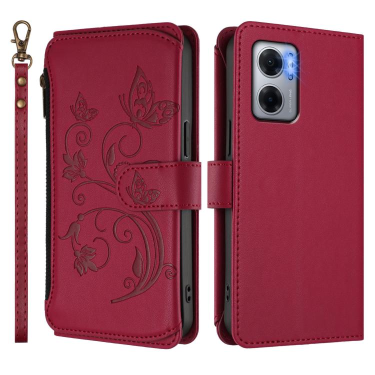 Funda de cuero con cremallera para Redmi 10 5G / Redmi 11 Prime 5G, diseño de mariposas, flores y mariposas (rojo vino)