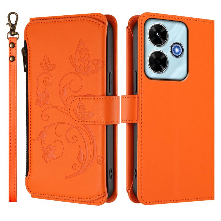 Funda de cuero con cremallera para Redmi 13 4G / 5G / 13x / Xiaomi Poco M6 4G, diseño de mariposas y flores, con múltiples tarjetas (naranja)