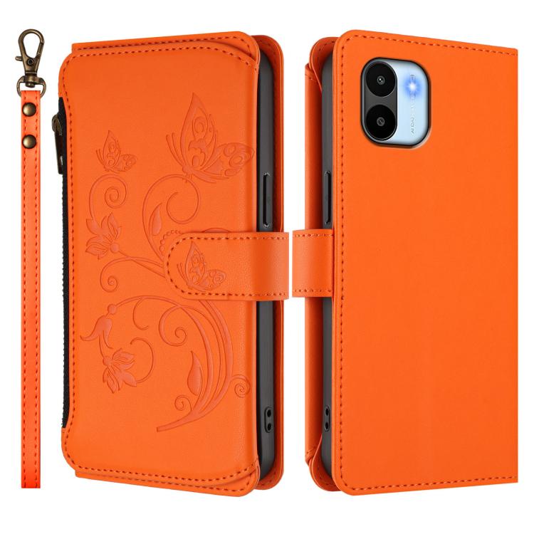 Funda de cuero con cremallera para Redmi A1/Redmi A2, diseño de mariposas y flores, con múltiples tarjetas (naranja)