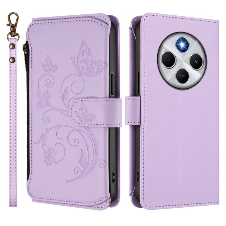Funda de cuero con cremallera para Redmi A4 5G / A3 Pro / 14C 4G / 14R, diseño de mariposas y flores, con múltiples tarjetas (morado claro)