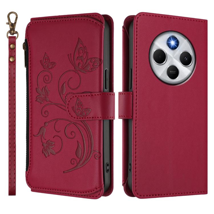 Funda de cuero con cremallera para Redmi A4 5G / A3 Pro / 14C 4G / 14R, diseño de mariposas y flores, con múltiples tarjetas (rojo vino)
