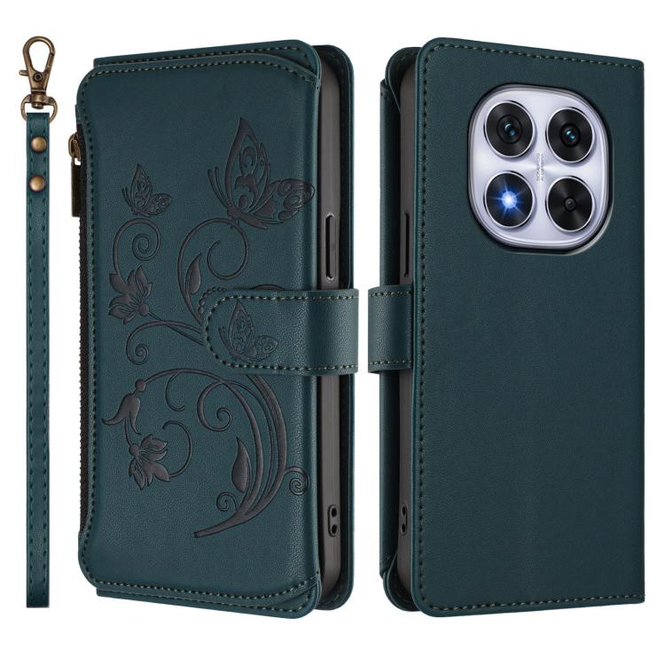 Funda de cuero con cremallera para Redmi Note 14 Pro 4G, diseño de mariposas, flores y mariposas (verde oscuro)