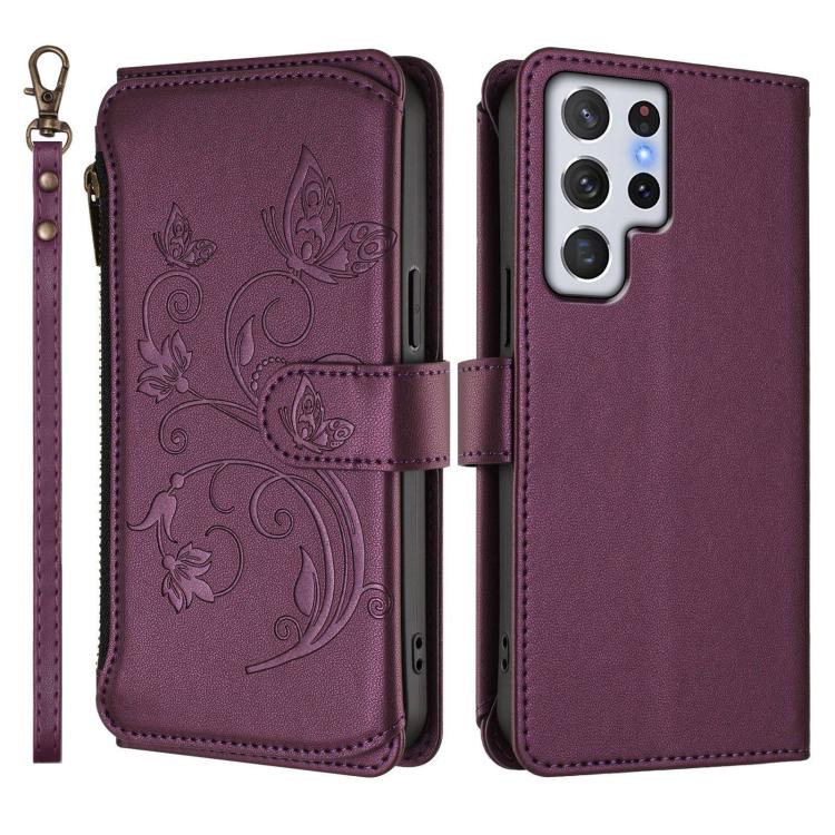 Funda de cuero con cremallera para Samsung Galaxy S22 Ultra 5G, diseño de mariposas, flores y amor, con múltiples tarjetas (morado oscuro)