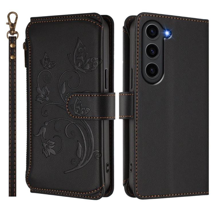 Funda de cuero con cremallera para Samsung Galaxy S23+ 5G, diseño de mariposas, flores y múltiples tarjetas (negro)