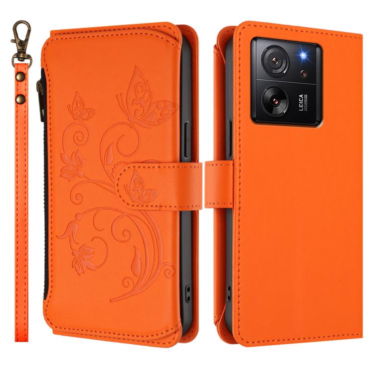 Funda de cuero con cremallera para Xiaomi 13T / 13T Pro / Redmi K60 Ultra, diseño de mariposas, flores y mariposas (naranja)