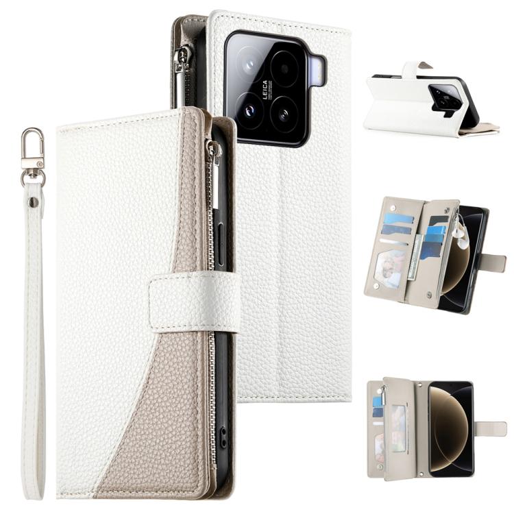 Funda de cuero con cremallera para Xiaomi 15, con múltiples tarjetas y costuras, con correa corta (blanca)