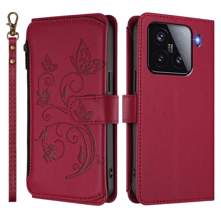 Funda de cuero con cremallera para Xiaomi 15, diseño de mariposas, flores y múltiples tarjetas (rojo vino)