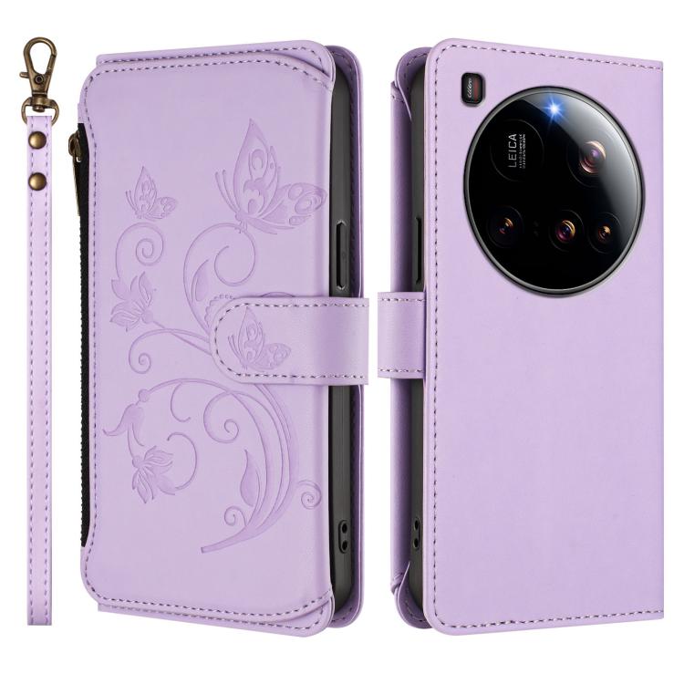 Funda de cuero con cremallera para Xiaomi 15 Ultra, diseño de mariposa, amor y flores, con múltiples tarjetas (morado claro)