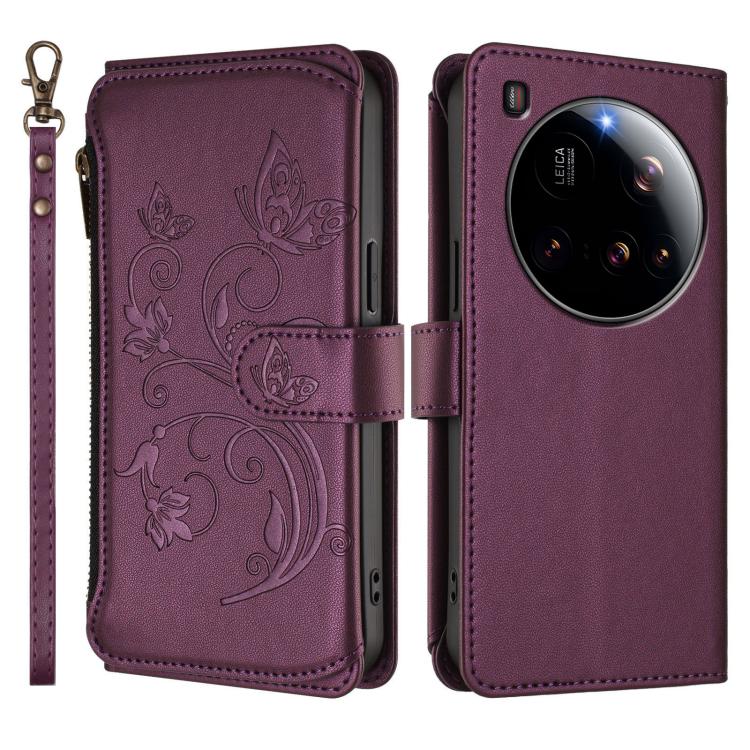 Funda de cuero con cremallera para Xiaomi 15 Ultra, diseño de mariposas y flores, con múltiples tarjetas (morado oscuro)