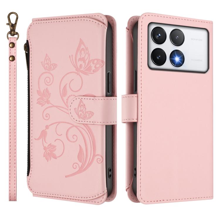 Funda de cuero con cremallera para Xiaomi Poco F6 Pro, diseño de mariposas, flores y mariposas (rosa)