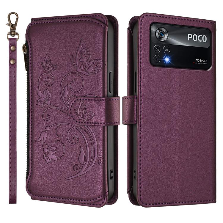 Funda de cuero con cremallera para Xiaomi Poco X4 Pro 5G, diseño de mariposas, flores y mariposas (morado oscuro)