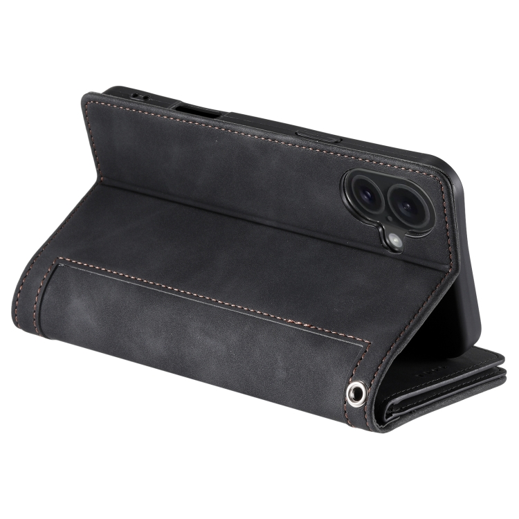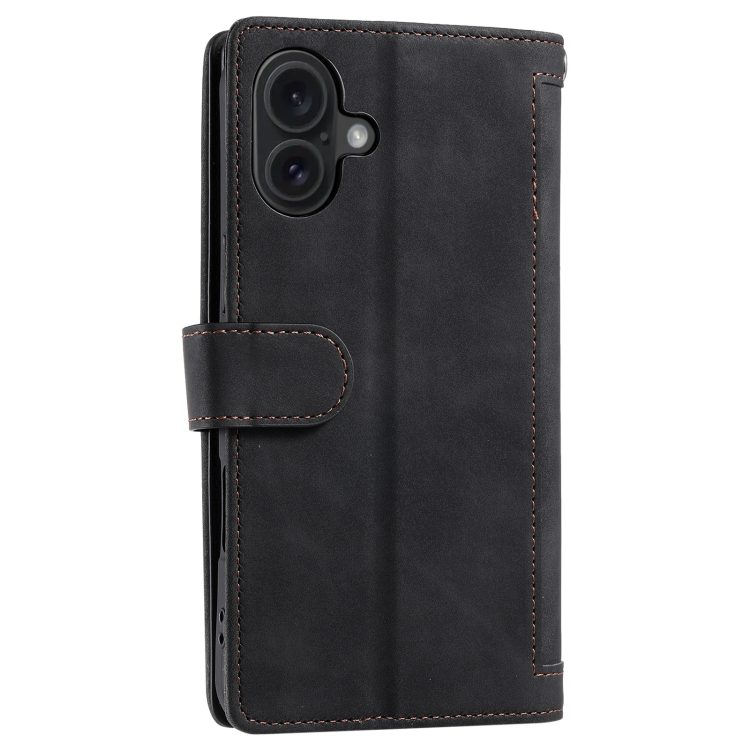 Funda de Cuero con Cremallera y Cordón para iPhone 16 Plus con Nueve Tarjetas (Negro)