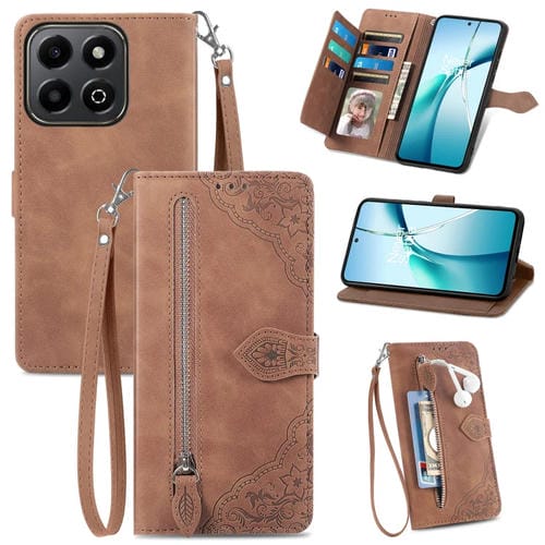 Funda de Cuero con Cremallera y Flores en Relieve para Honor 200 (Marrón)