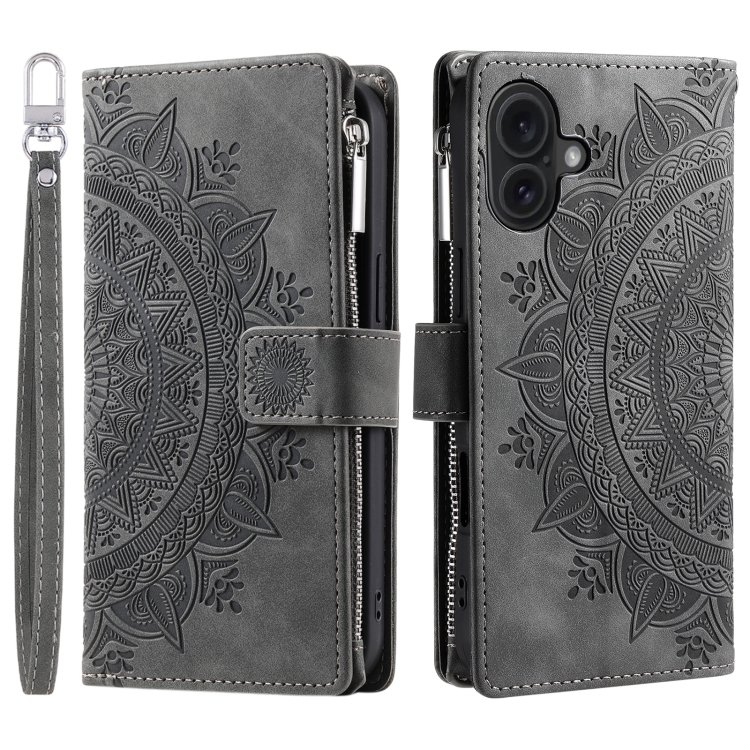 Funda de Cuero con Cremallera y Múltiples Tarjetas para iPhone 16 Plus (Gris)