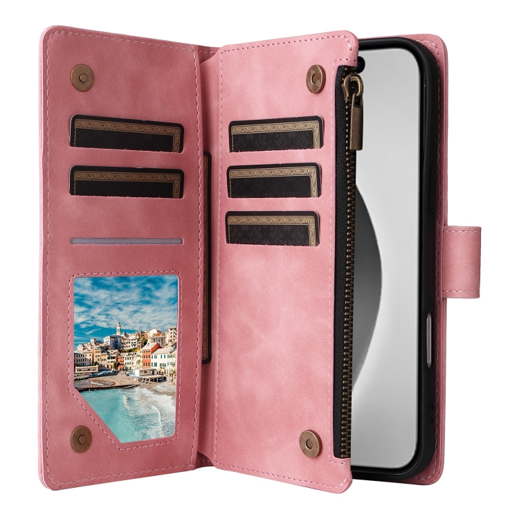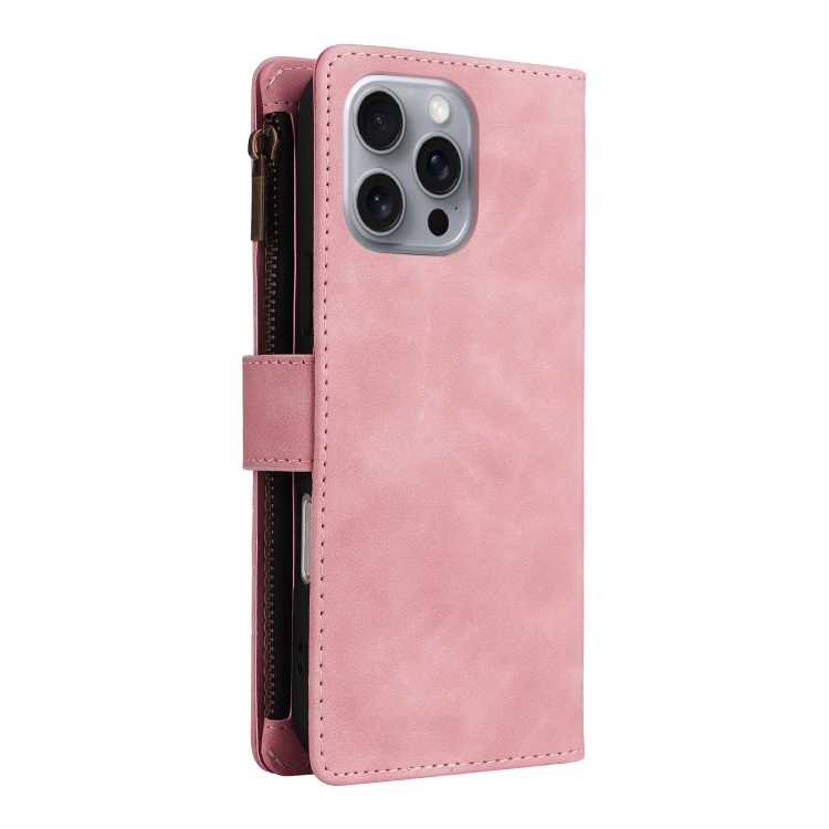 Funda de Cuero con Cremallera y Ranura para Tarjetas para iPhone 16 Pro (Rosa)