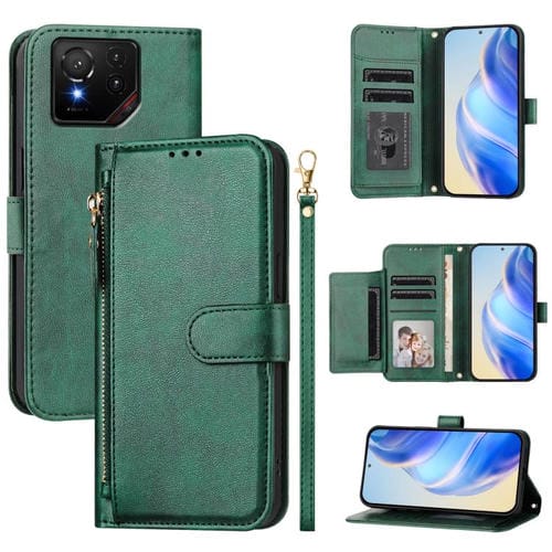 Funda de Cuero con Cremallera y Ranuras para Tarjetas para Asus Rog Phone 9/Phone 9 Pro (Verde)