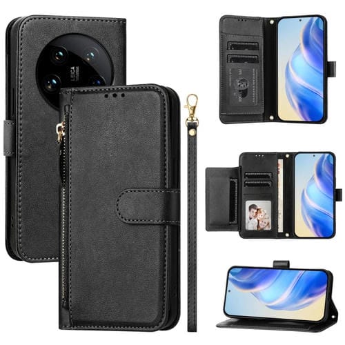 Funda de Cuero con Cremallera y Ranuras para Múltiples Tarjetas para Xiaomi 14 Ultra Global (Negro)