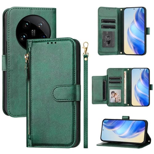 Funda de Cuero con Cremallera y Ranuras para Múltiples Tarjetas para Xiaomi 14 Ultra Global (Verde)