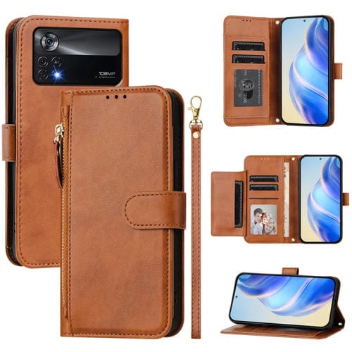 Funda de Cuero con Cremallera y Ranuras para Varias Tarjetas para Xiaomi Poco X4 Pro 5G (Marrón)