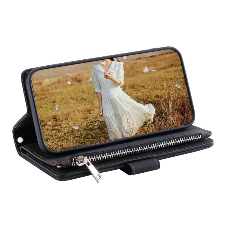 Funda de Cuero con Cremallera para iPhone 16E con Textura de Cuadrícula y Cordón (Negro)