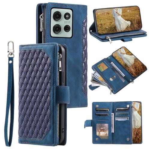 Funda de Cuero con Cremallera y Textura de Cuadrícula para Motorola Moto G75 5G con Cordón (Azul)