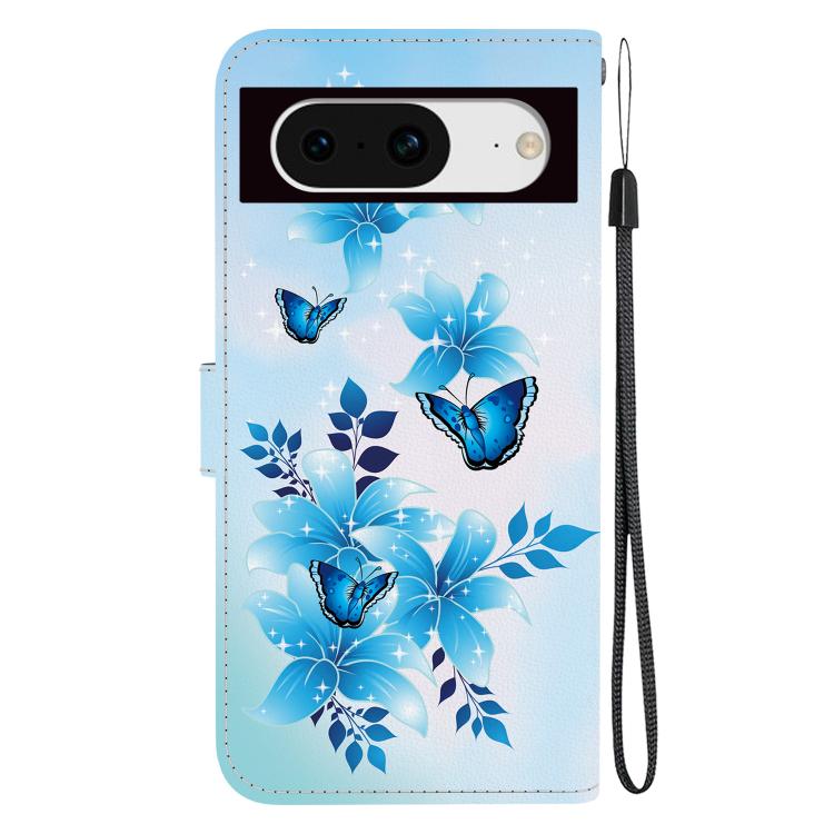 Funda de Cuero para Google Pixel 8 con Dibujo de Colores y Textura de Cristal (Mariposas Azules)