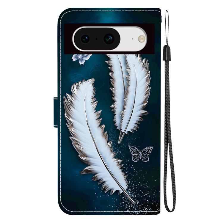 Funda de Cuero para Google Pixel 8 con Dibujo de Colores y Textura de Cristal (Plumas de Mariposa Blancas)