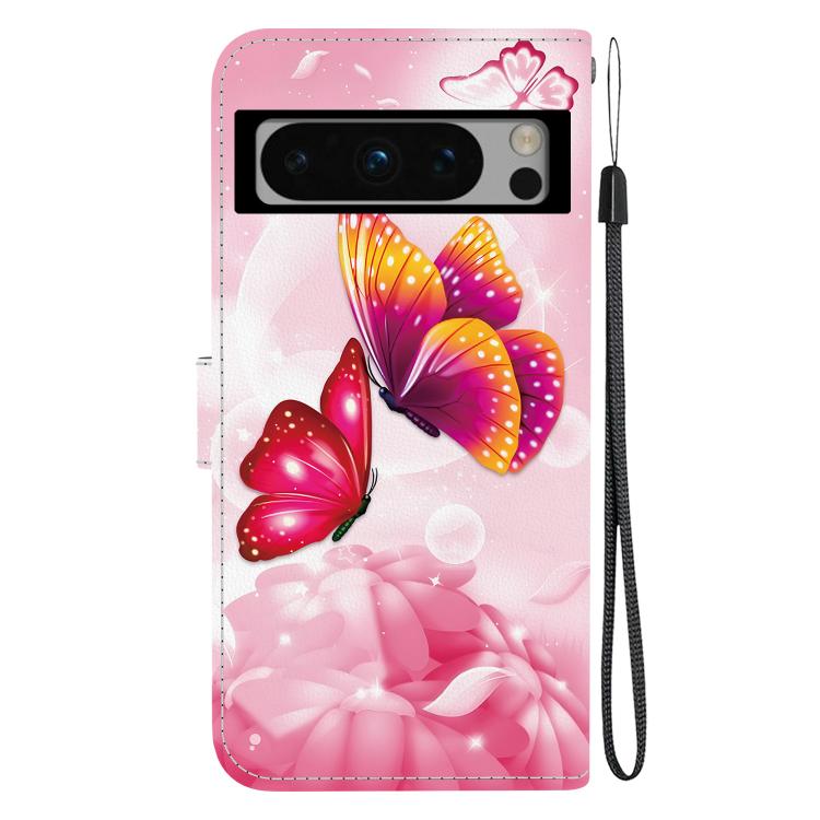 Funda de Cuero para Google Pixel 8 Pro con Dibujo de Colores y Textura de Cristal (Mariposas Rosas)