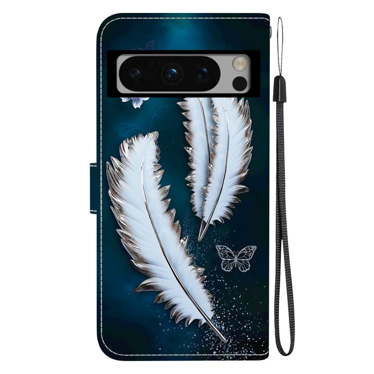 Funda de Cuero para Google Pixel 8 Pro con Dibujo de Colores y Textura de Cristal (Plumas de Mariposa Blancas)