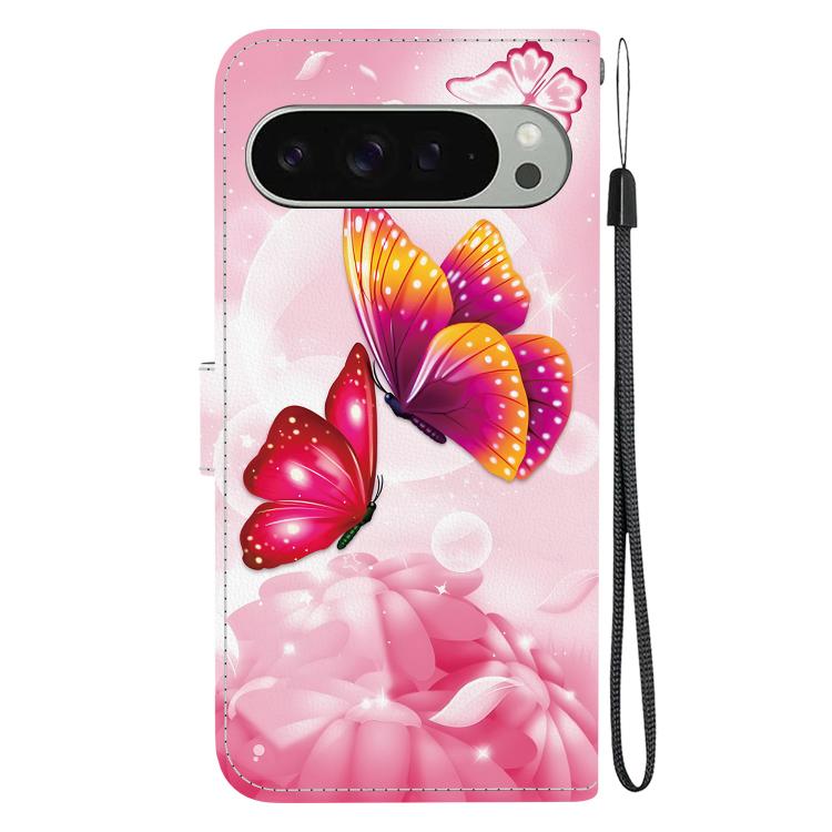 Funda de Cuero con Dibujo de Colores y Textura de Cristal para Google Pixel 9/9 Pro (Mariposas Rosas)