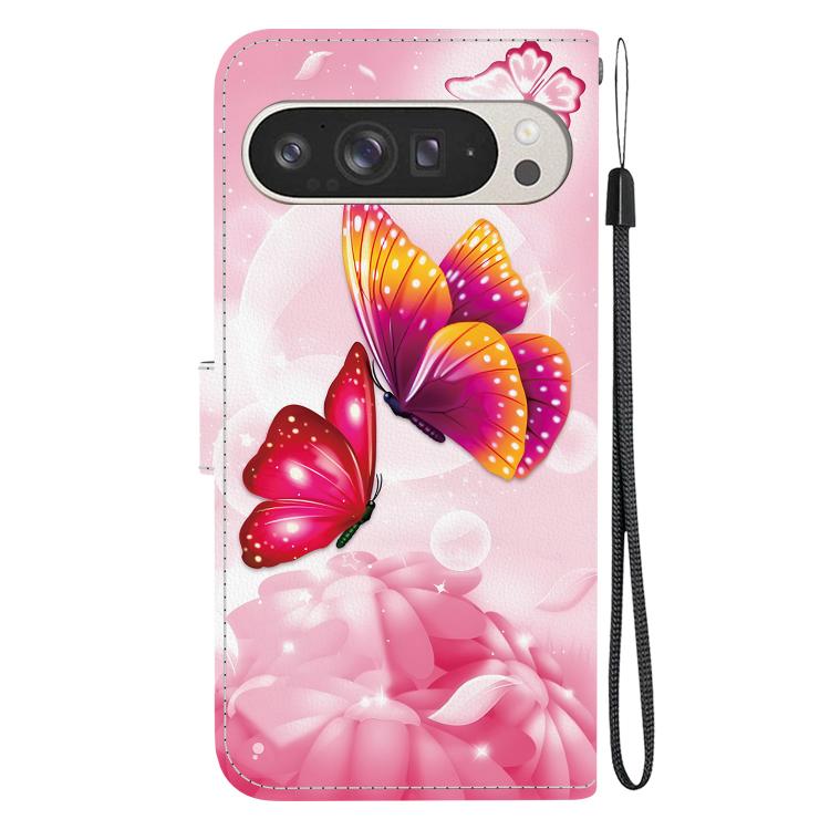 Funda de Cuero para Google Pixel 9 Pro XL con Dibujo de Colores y Textura de Cristal (Mariposas Rosas)