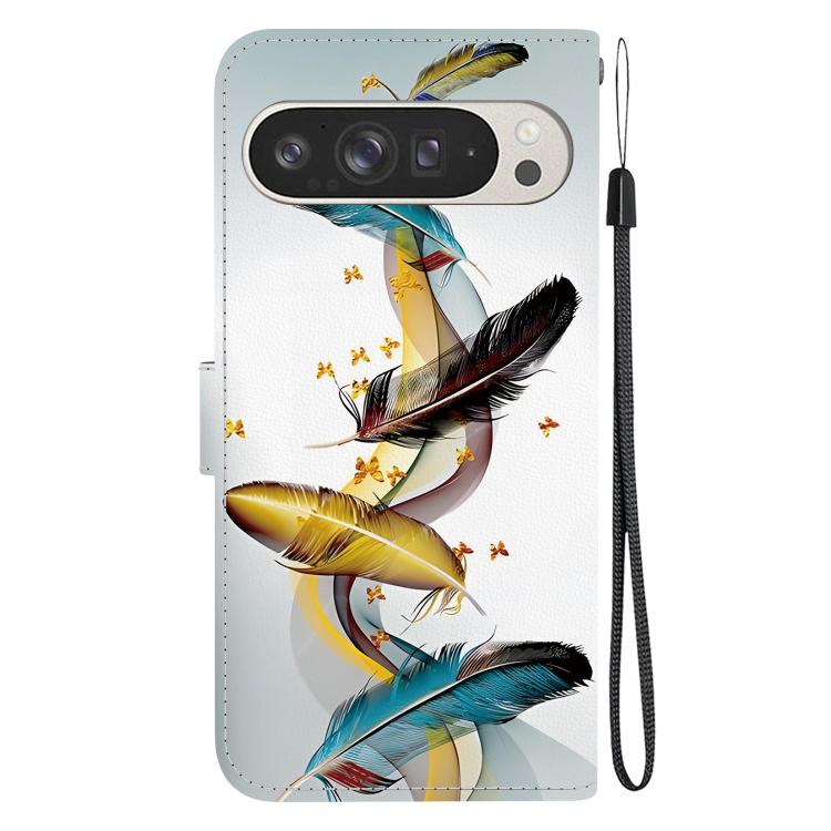 Funda de Cuero para Google Pixel 9 Pro XL con Dibujo de Colores y Textura de Cristal (Plumas de Mariposa Doradas)