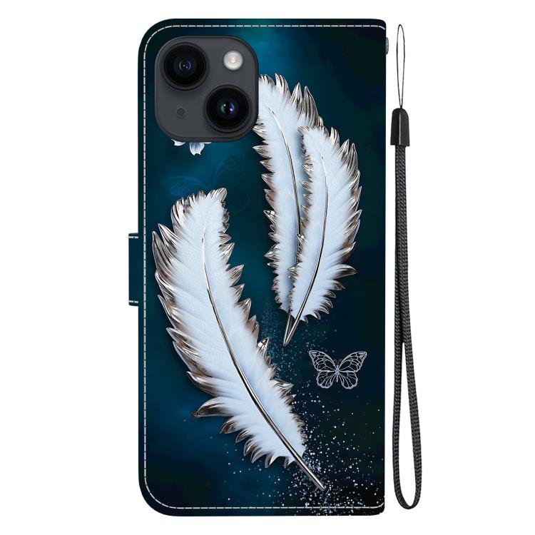 Funda de Cuero para iPhone 15 con Dibujo de Colores y Textura de Cristal (Plumas de Mariposa Blancas)