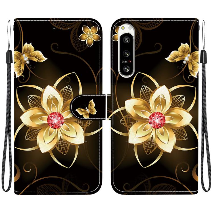 Funda de Cuero para Sony Xperia 10 Vi con Dibujo de Colores y Textura de Cristal (Flor Dorada)