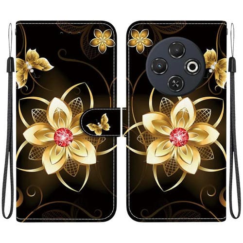 Funda de Cuero para Tecno Spark 30C con Dibujo de Colores y Textura de Cristal (Flor Dorada)