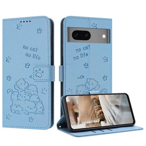 Funda de Cuero Google Pixel 7 con Diseño de Gatito en Relieve y Cordón (Azul)