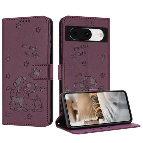 Funda de Cuero Google Pixel 8 con Diseño de Gatito En Relieve y Cordón (Rojo Vino)