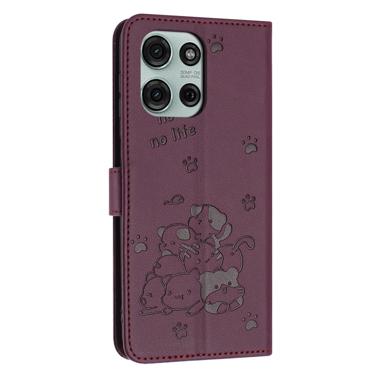 Funda de Cuero para Motorola Moto G75 con Diseño de Gatito en Relieve y Cordón (Rojo Vino)