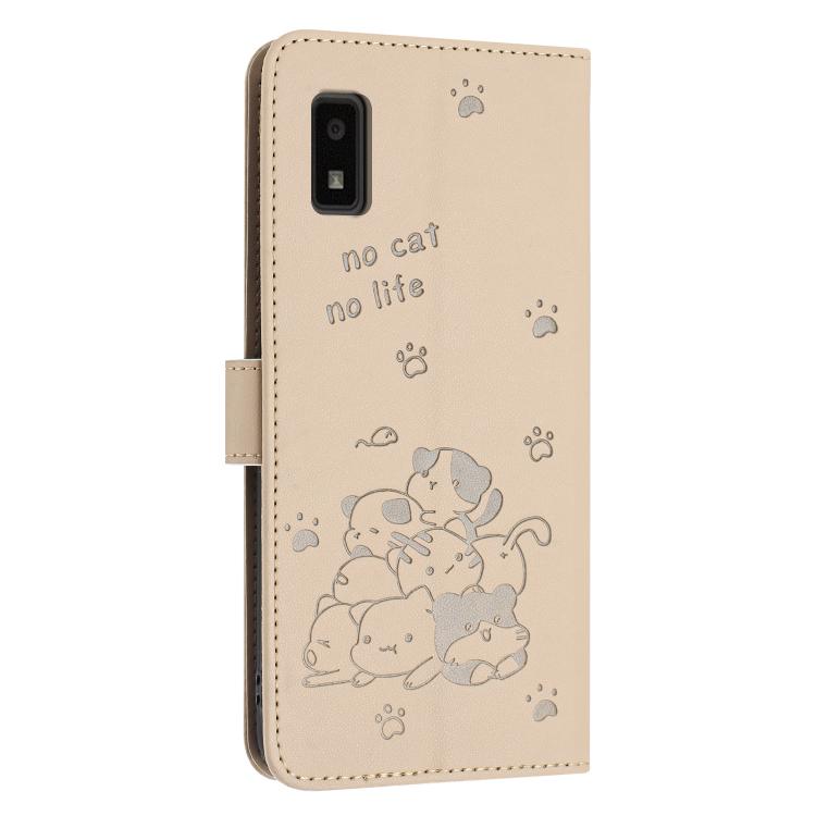 Funda de Cuero para Sharp Aquos Wish 3 con Diseño de Gatito En Relieve y Cordón (Beige)