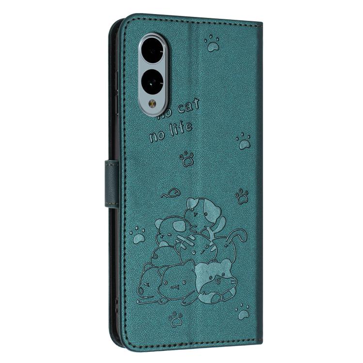 Funda de Cuero para Fujitsu Arrows We2 Plus F-51E con Diseño de Gatito y Cordón (Verde Oscuro)