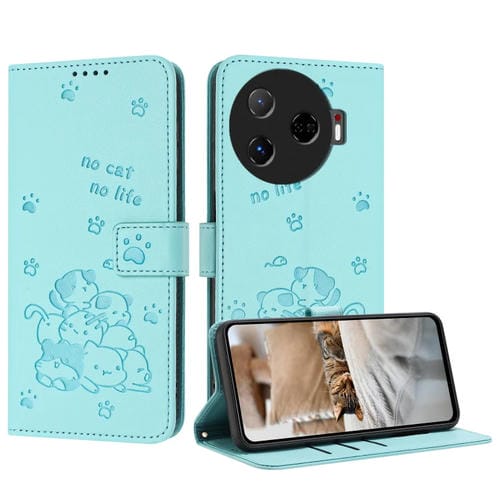 Funda de Cuero para Tecno Camon 30 Pro 5G con Diseño de Gatito y Cordón (Verde Menta)