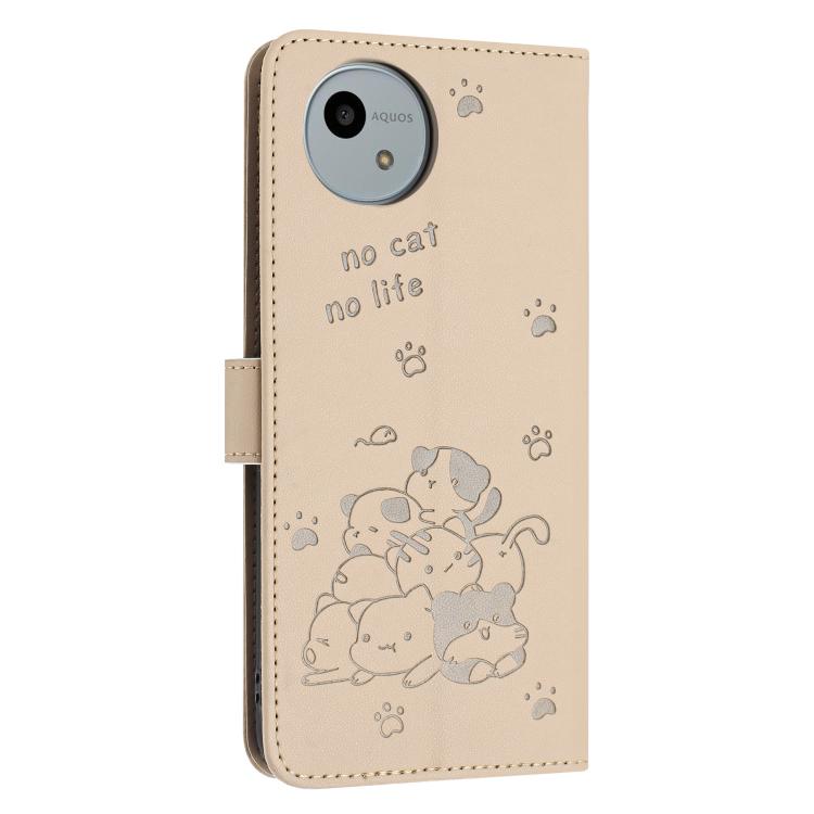 Funda de Cuero para Sharp Aquos Wish4 Sh-52E con Diseño de Gatito en Relieve y Cordón (Beige)