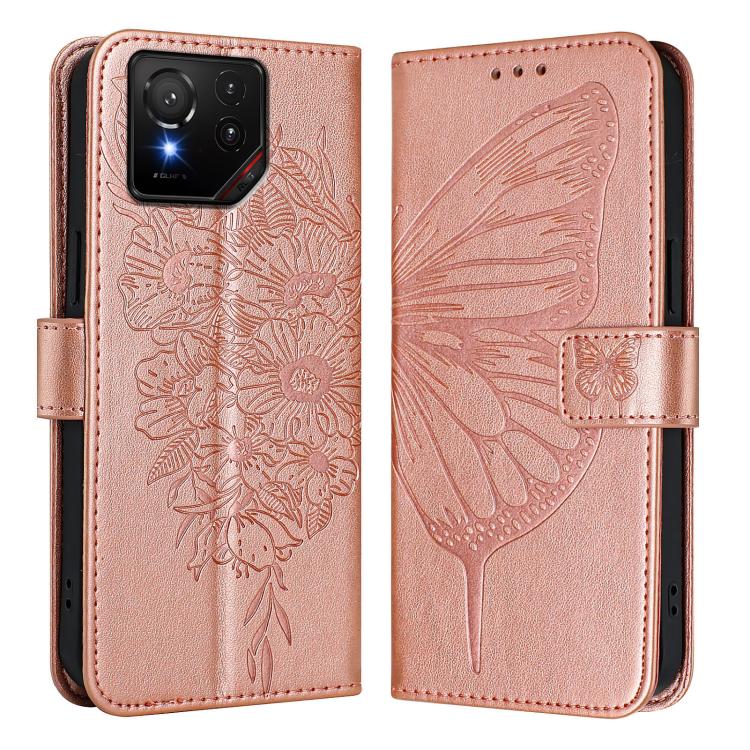 Funda de Cuero Asus Rog Phone 9/9 Pro con Diseño de Mariposa en Relieve (Oro Rosa)