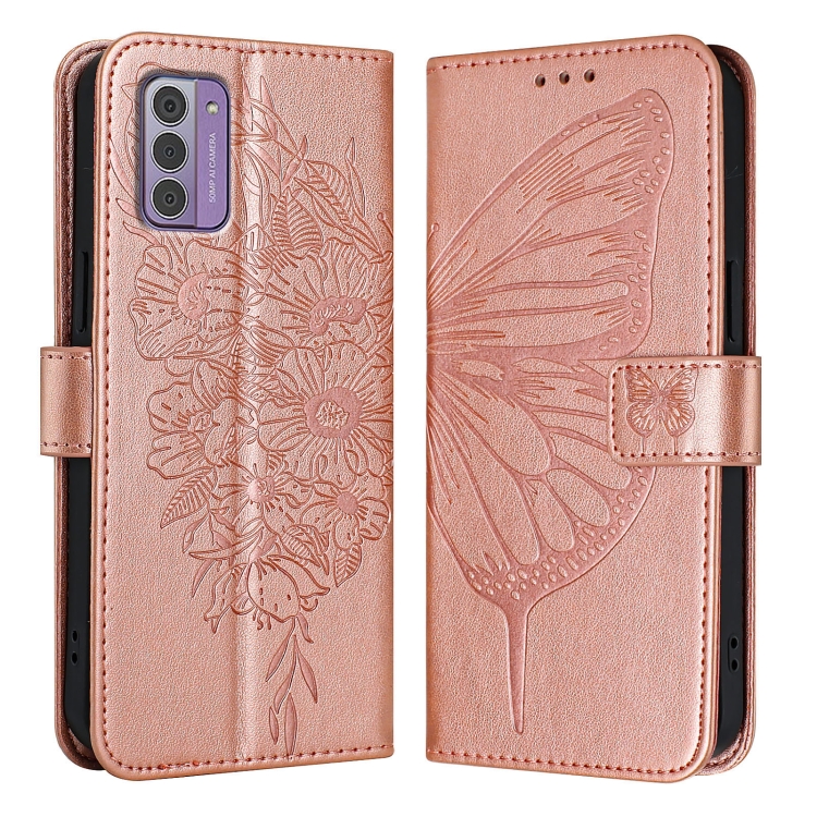 Funda de Cuero para Nokia G42/G310 con Diseño de Mariposa en Relieve (Oro Rosa)